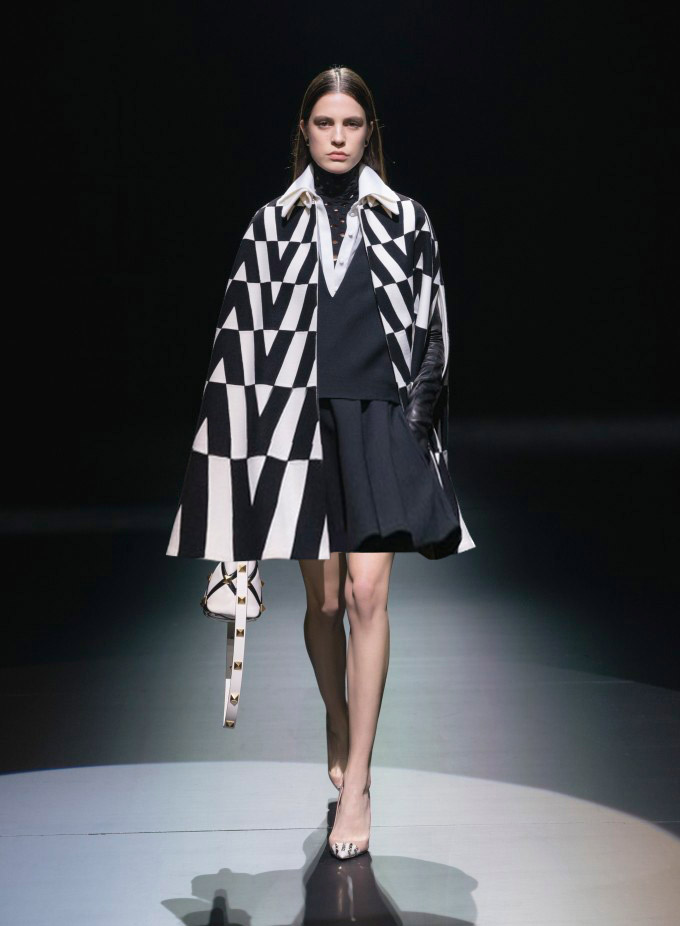 كاب أنيق باللون الأبيض والأسود بطبعة الحرف الأول من العلامة، الكاب بتصميم الياقة العالية مع أكمام طويلة ومشقوقة. يمكنك تنسيق هذا الكاب للإطلالة العملية أو السهرات الرسمية.