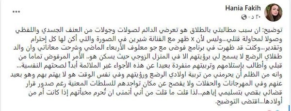 كما قامت هانيا فقيه بتوضيح سبب هجومها على زوجها “سبب مطالبتي بالطلاق هو تعرضي الدائم لصولات وجولات من العنف الجسدي واللفظي وصولا لمحاولة قتلي، وليس لأنه ظهر مع الفنانة شيرين في الصورة والتي أكن لها كل احترام وتقدير”.