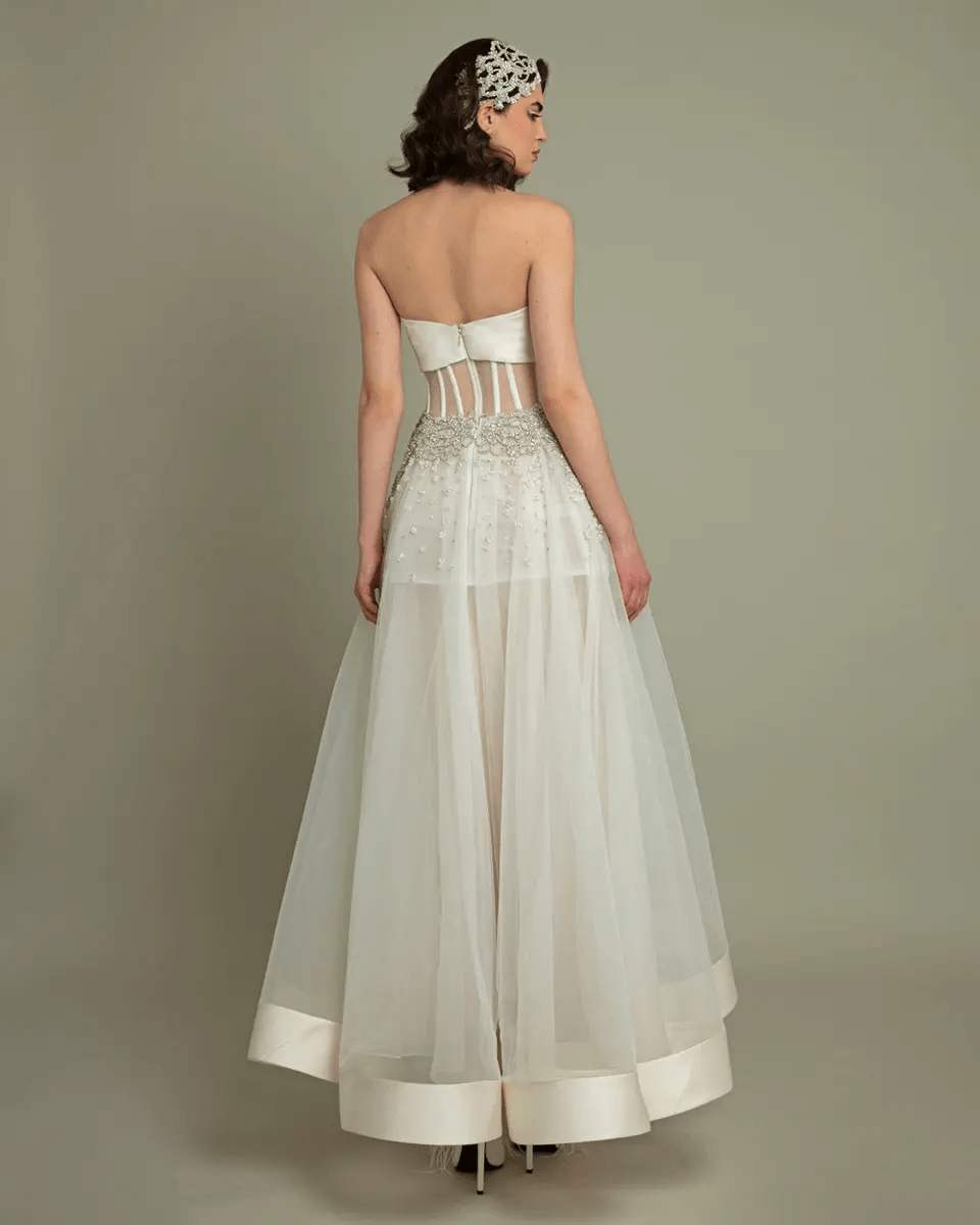 فستان زفاف بلون البيج الشامبانيا، مطرز في أعلى التنورة الإضافية بالستراس الذهبي والعاجي، مع لمسات من الورود الصغيرة. وهو يعتبر من أفضل تصاميم 2023.