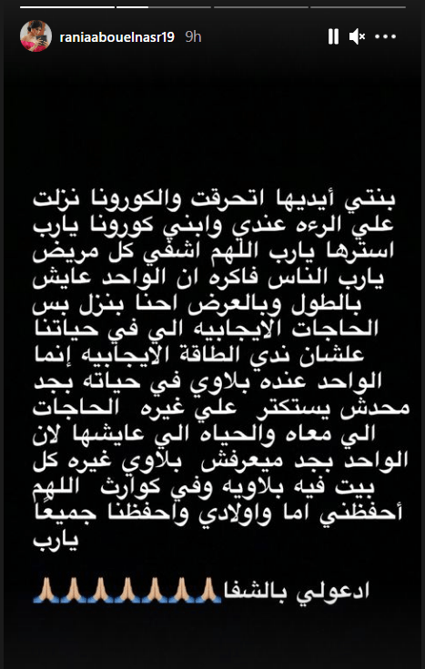 على إثر إصابة رانيا أبو النصر زوجة ماجد المصري وابنه بفيروس كورونا، قامت الأخيرة بنشر دعاء عبر خاصية الستوري على حسابها الخاص على الانستغرام لكن ما أثار استغراب المتابعين هو بعض الكلمات المؤثرة “يا رب الناس فاكره إن الواحد عايش حياته بالطول والعرض إحنا بنزل بس الحاجات الإيجابية اللي في حياتنا عشان ندي الطاقة ايجابية”.