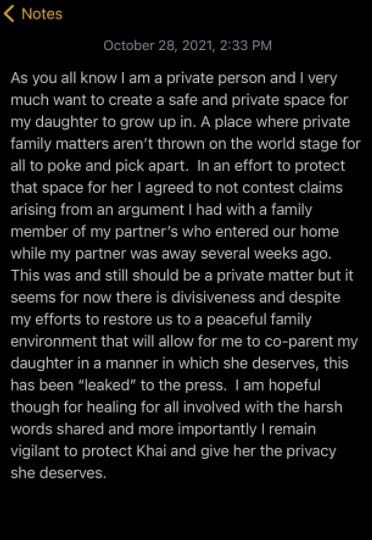 وقد أشار وكيل أعمال جيجي حديد أنها تطالب بالخصوصية وأنها لا تفكر إلا في تقديم ما هو جيد لابنتها خاي.
