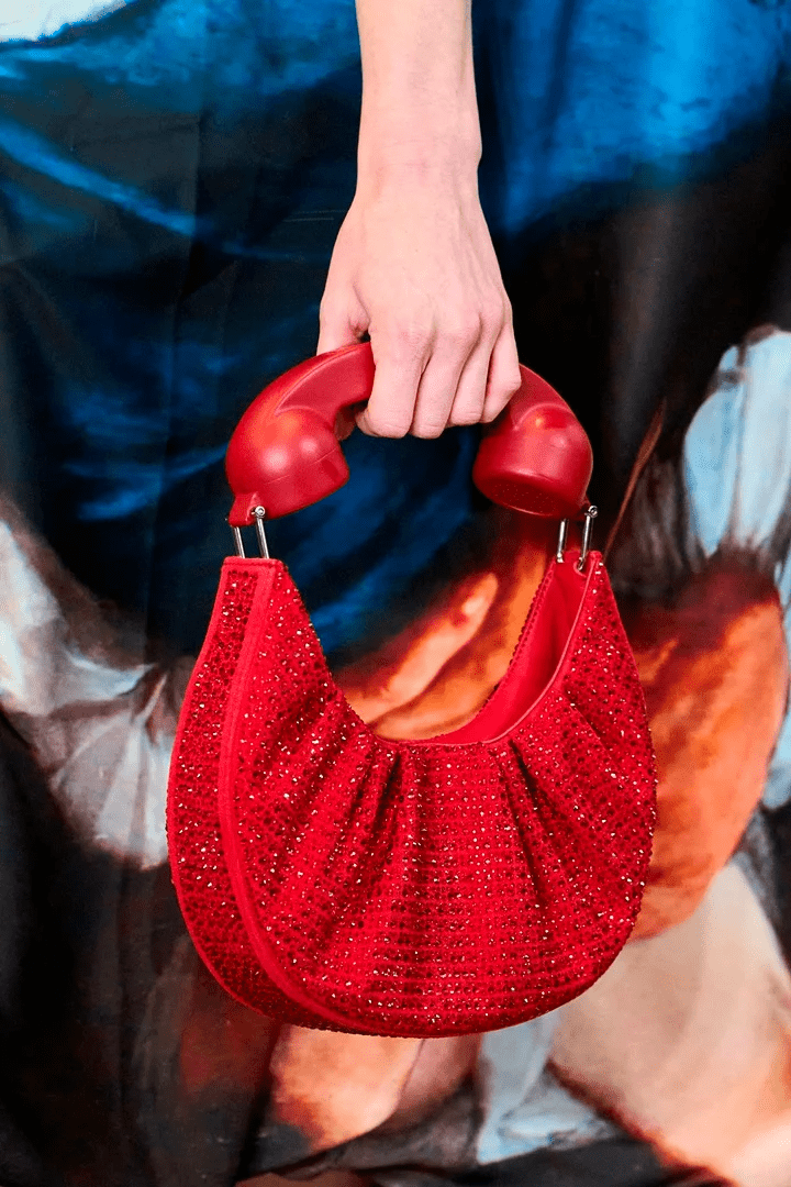 لمحبات التصاميم اللامعة والبراقة، سينال إعجابك تصميم حقيبة بابيت Puppets المطرزة بالكامل بالخرز والتي تتميز بمقبضها على شكل هاتف منزلي لإظافة لمسة من الجرأة الساحرة.