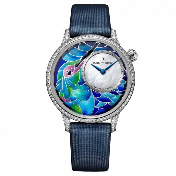 من علامة جاكيه درو نستعرض هذا الموديل والذي يأتيك من الذهب الأبيض الذي يزينه الألماس البراق مع رسوم اناميل تصور طيور الطنانة، في تصميم مميز.