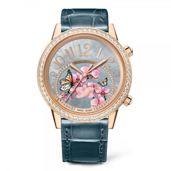 انتقينا لك من جيجر لوكولتير هذا الموديل المتألق بالذهب الوردي المزين بالألماس، عرق اللؤلؤ والاناميل، في تصميم يحتوي رسومات زهور الأوركيد وفراشات بأسلوب فاتن وأنثوي.