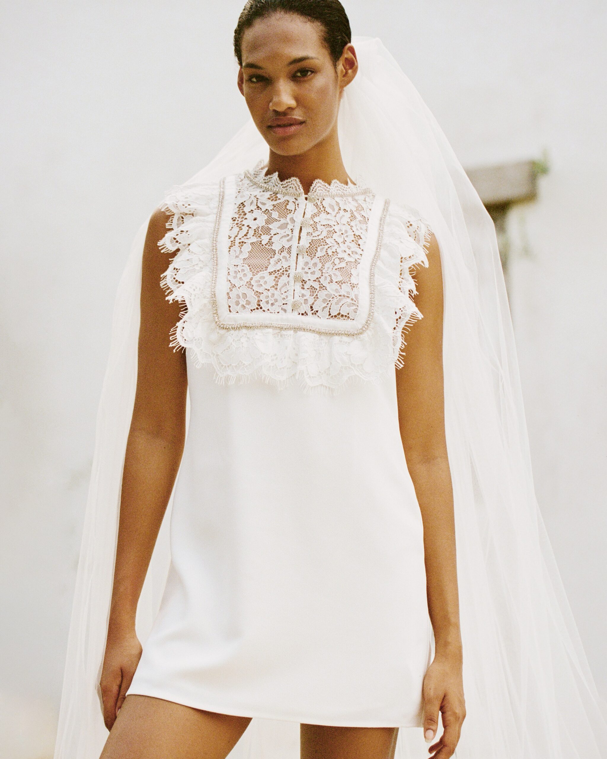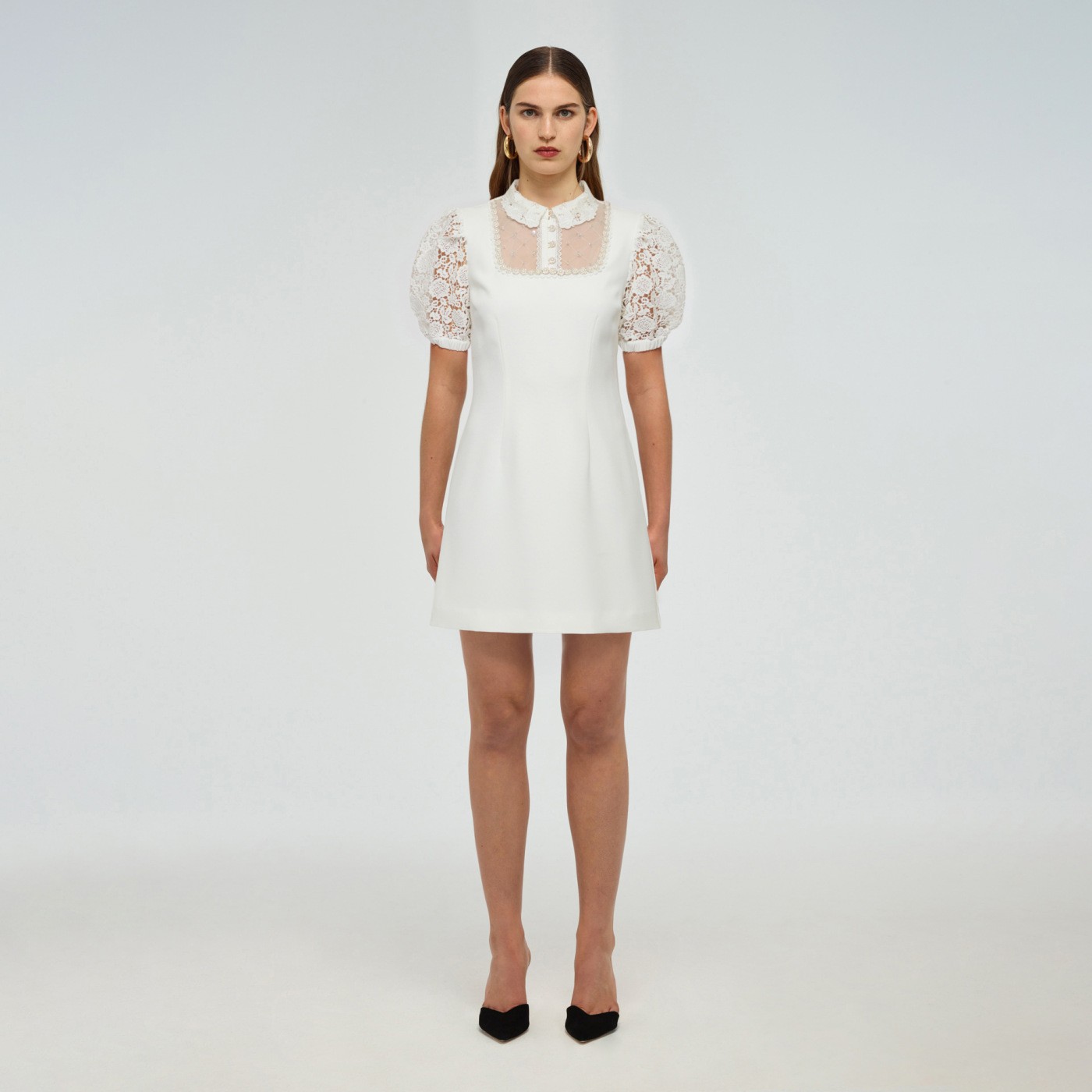 قدمت Self Portrait فستان قصير مع ياقة ماندرين، وخط العنق المزوق بالدانتيل الزهري.