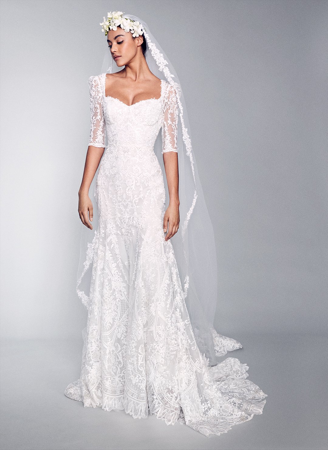 استخدمت Marchesa طبعات زهرية على فساتين الزفاف على شكل حورية البحر، ولإطلالة رومنسية جذابة حالمة، يمكنك إضافة تاج من الزهور على الشعر.