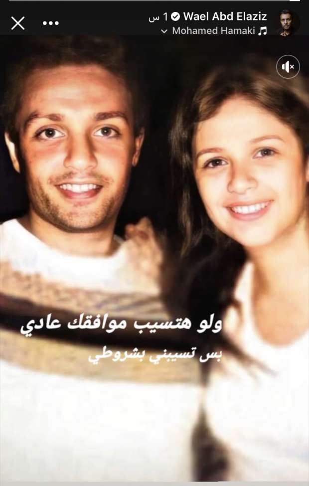 نشر وائل عبد العزيز صورة قديمة رفقة شقيقته ياسمين عبد العزيز عبر خاصية الستوري وقد أرفقها بجملة قصير “لو هتسيب موافقك عادي بس تسيبني بشروطي” وهي من أغنية للفنان المصري محمد حماقي.
