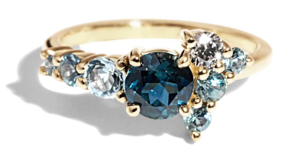 رصع هذا الخاتم بحجر ياقوت أزرق مستدير رئيسي وماس الشمبانيا واثنين من الياقوت الأزرق المخضر واثنين من الياقوت الأزرق وحجر زبرجد وياقوت بحري.