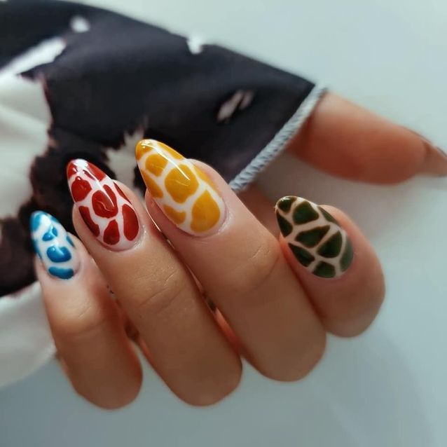 مناكير بنقشة جلد البقرة بألوان بارزة مختلفة مثل الأزرق، الأخضر، الأحمر والأصفر مع قاعدة مناكير بيضاء.