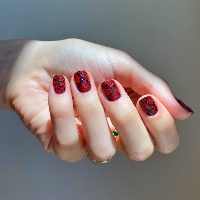 أظافر قصيرة مع مناكير باللون الأحمر والأسود بنقشة جلد الثعبان