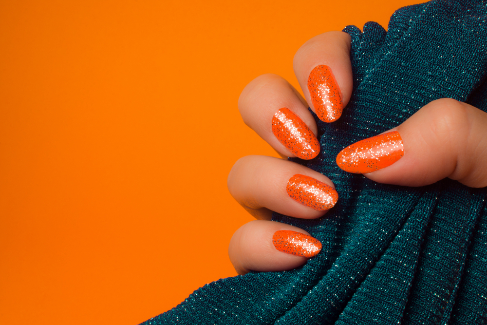 طلاء أظافر برتقالي نيون على مقدمة الأظافر
