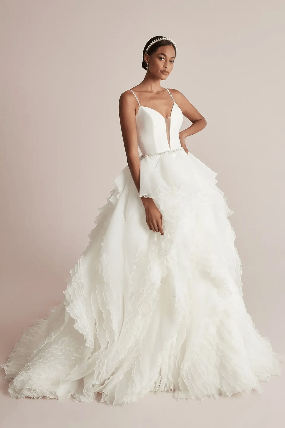 ابتكر جاستن ألكساندر هذه التصاميم الراقية، حيث ستحبين الكشكشة سواء في فستان زفاف كاريسا أو فستان حورية البحر كوبر.