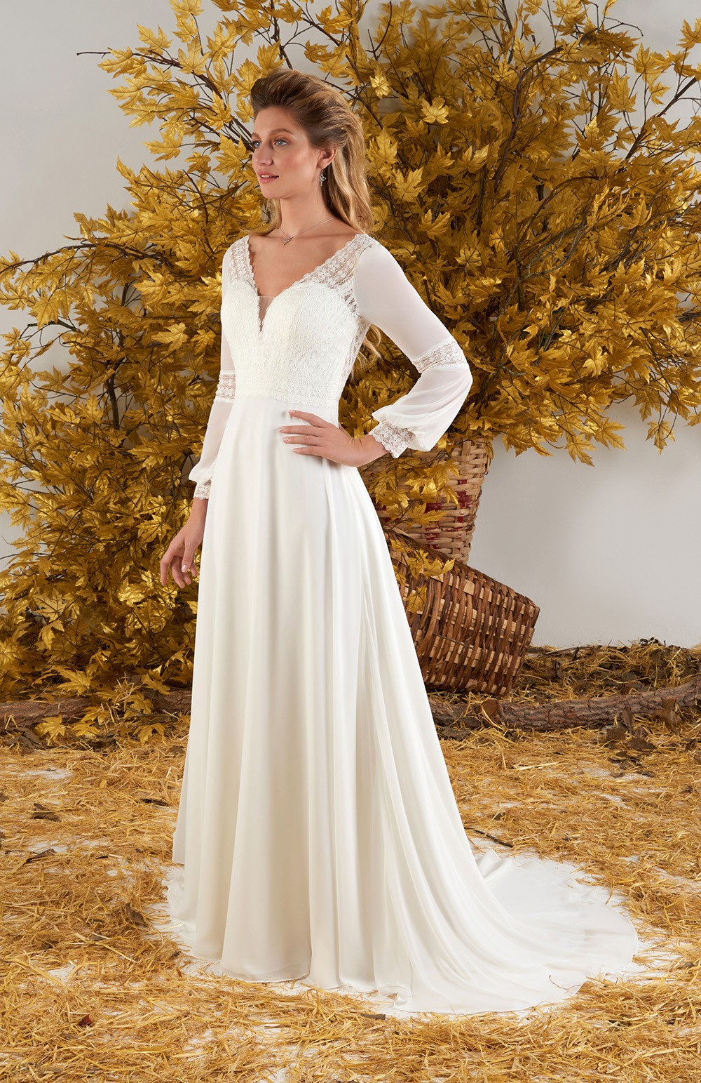 فستان زفاف بأكمام طويلة، مزينة بالدانتيل مع تنورة انسيابية، للتمتع بمظهر راقي وحتى تتمكني من التنقل بين الحاضرين بسهولة وبكل أريحية.