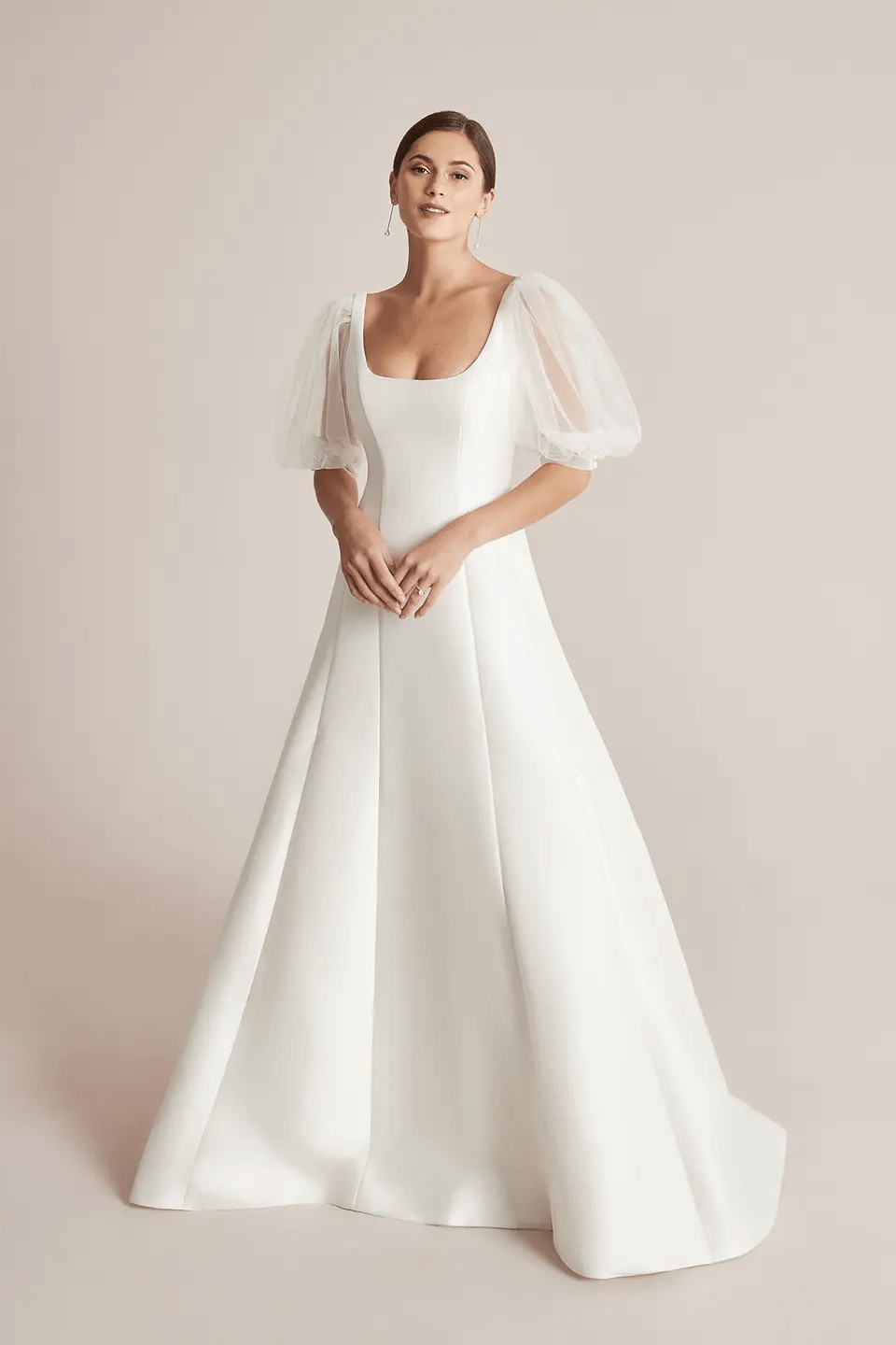 من أفضل فساتين الزفاف ضمن مجموعة خريف 2023، حيث ستنال إعجابك التنورة الضخمة والخفيفة والمصحوبة بجزء علوي من القماش الأبيض اللامع وخط عنق عميق للغاية.