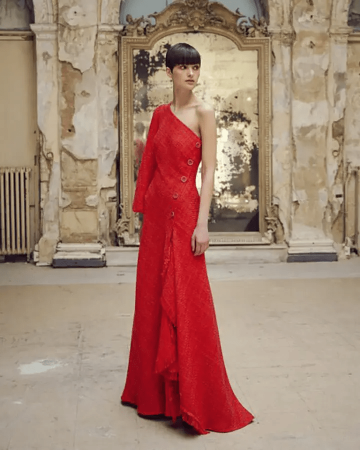 إذا كان اللون الأحمر مفعمًا بالحيوية من تلقاء نفسه، فسيكون أكثر جاذية إذا قمت بإختيار قماش لامع أو إكسسوارات مطرزة.