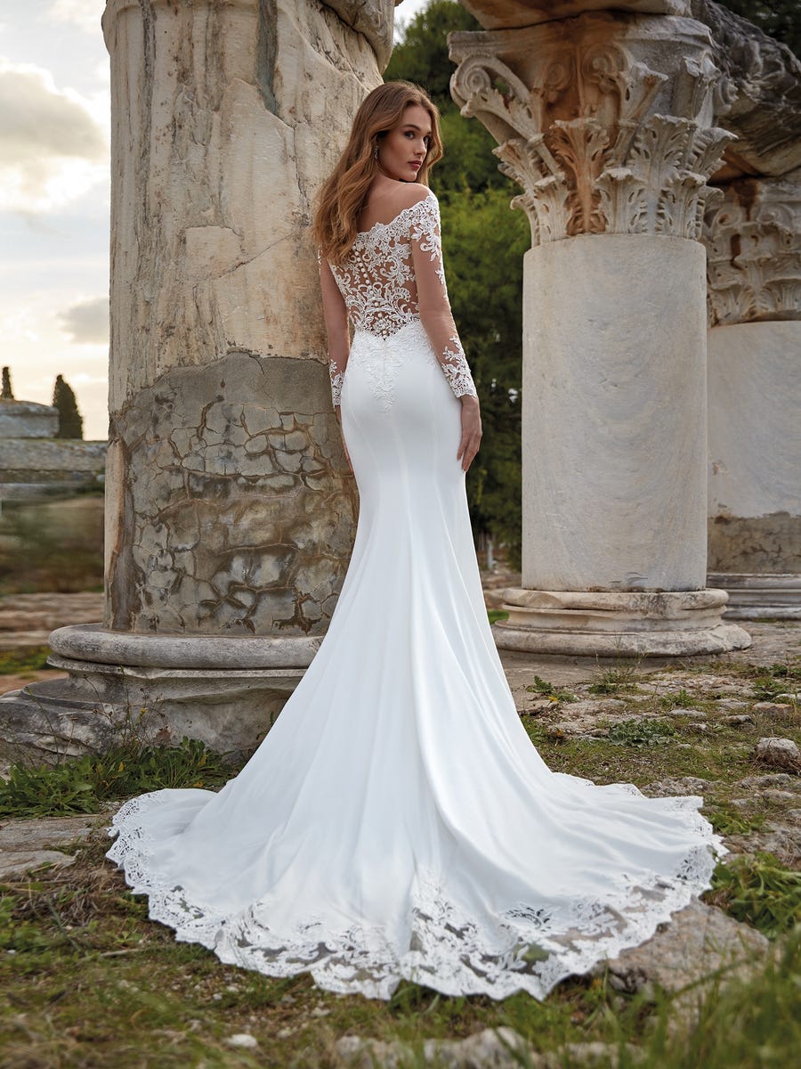 فستان بتصميم ساحر بقماش الكريب الأبيض مزين بالدانتيل في مستوى ذيل الفستان الطويل وعلى مستوى الصدر والأكمام الطويلة التي زادت من جمال وروعة التصميم.