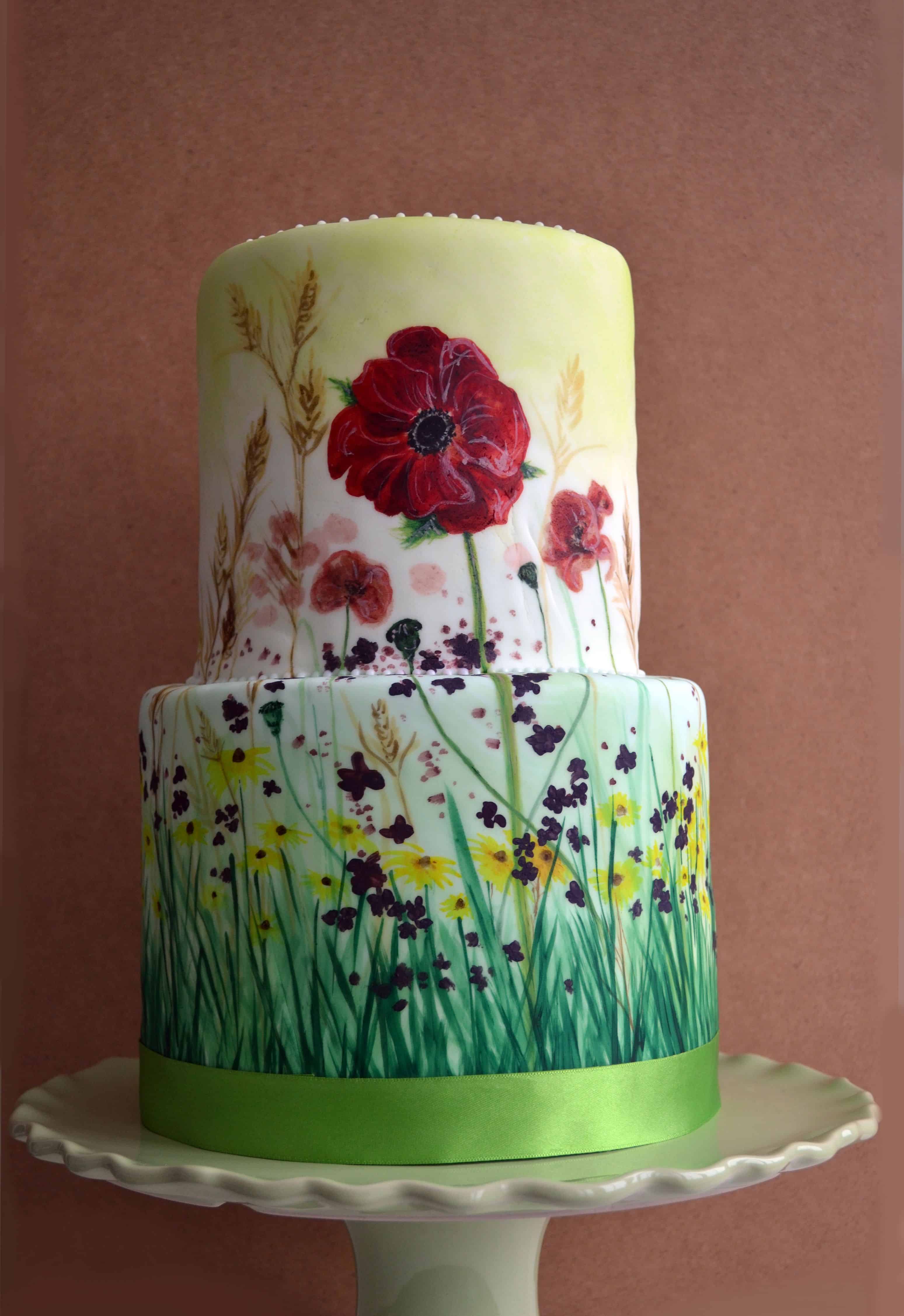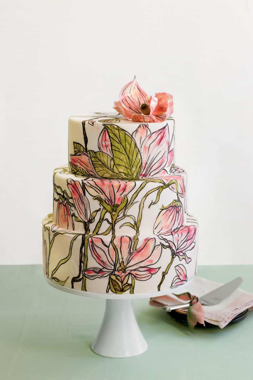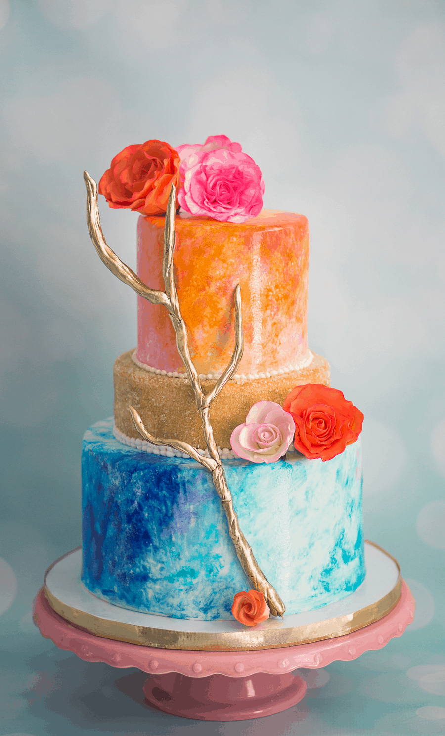 من أشهر أنواع الكعك لسنة 2019 الكعك المطلي باليد. يفتح هذا النوع الأبواب للإبداع. إذ يمكن لمصمم كعكة زفافك استعمال الألوان المائية.