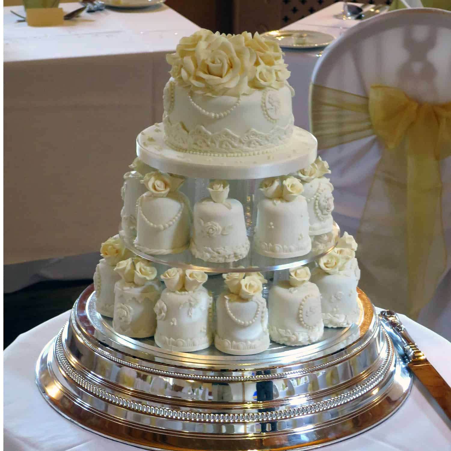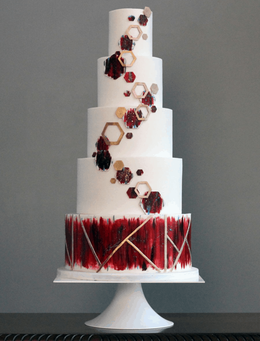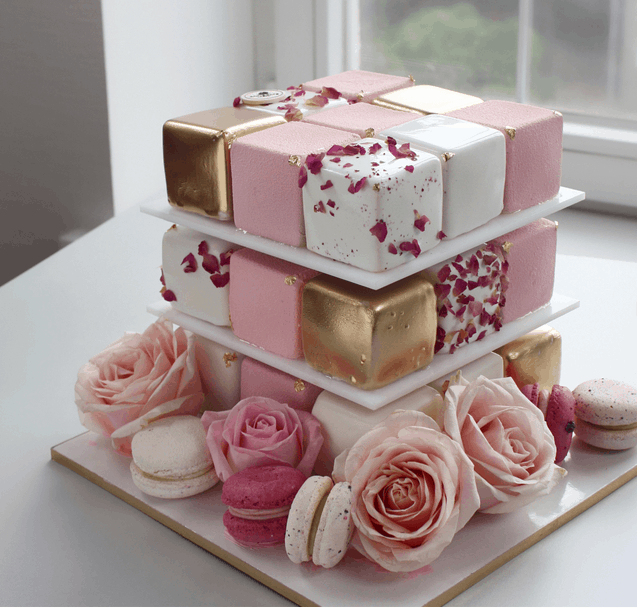 كما يمكن استعمال العديد من الأشكال الهندسية المنفصلة لتشكيل كعكة زفاف مميزة كما يظهر بالصورة.