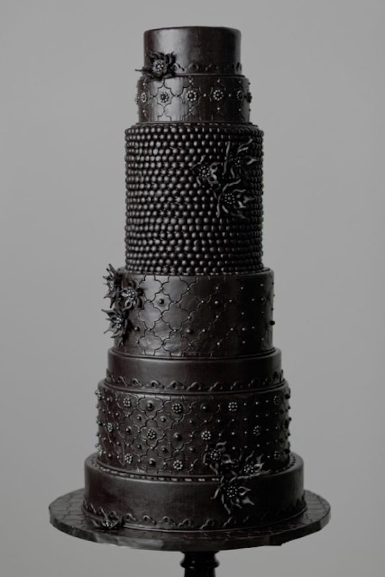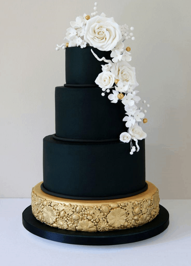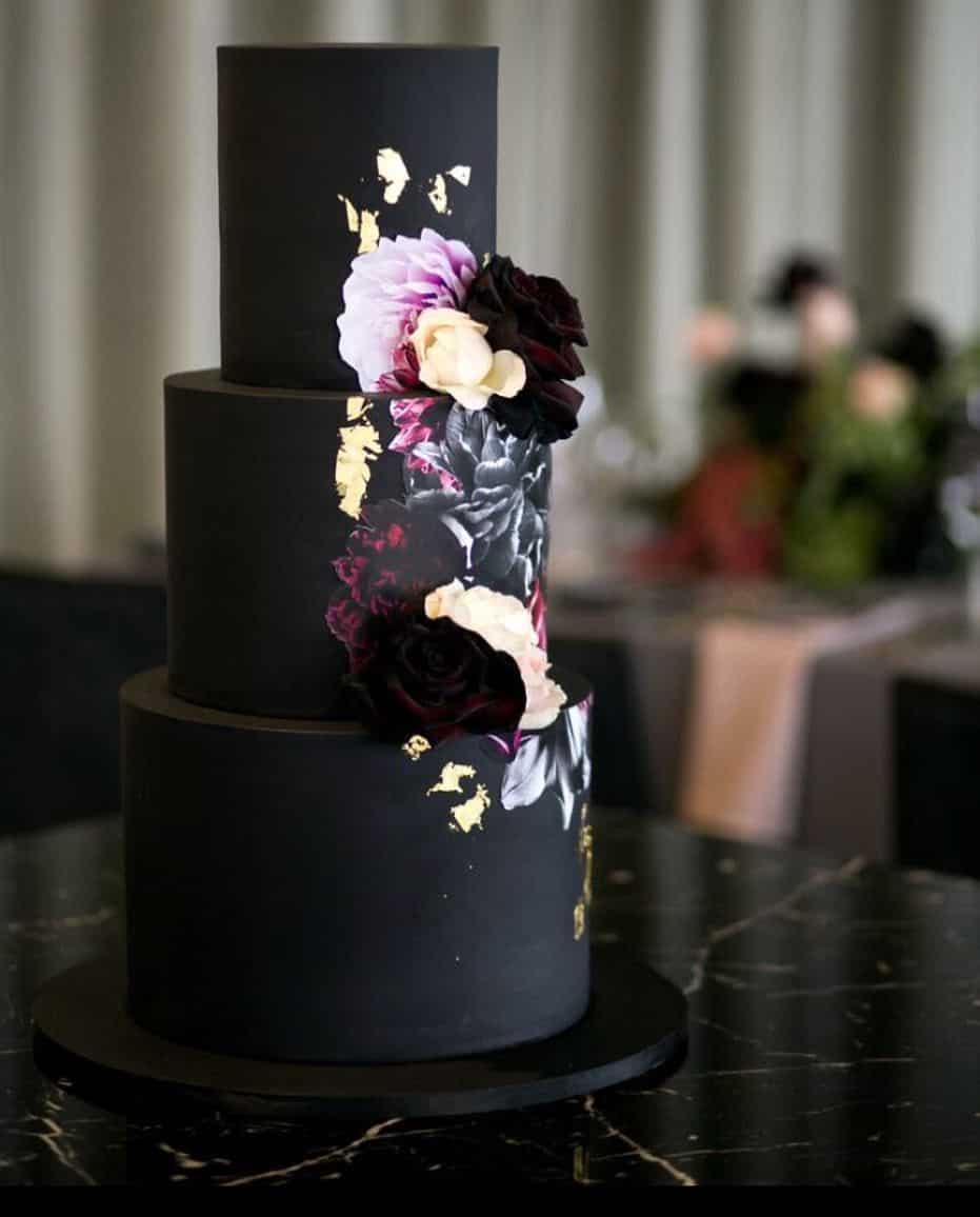 يمكن إضافة بعض الألوان لإضفاء حركية وبهجة على أناقة الأسود كأن تزين الكعكة السوداء بالورود كما في الصورة