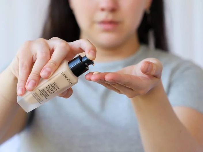ضعي كريم الأساس على جميع أنحاء البشرة وادمجيه جيدا، نقترح عليك كريم أساس لانكوم تينت أيدول ألترا وير 24 ساعة لثبات يدوم.