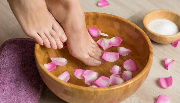 - قومي بنقع قدميك لمدة ربع ساعة في ماء دافئ مضاف إليه ملح خشن و ملعقة كبيرة من كربونات الصودا وبعض بتلات الورد. ثم قومي بتنظيف الجلد حول الأظافر و كعب القدم، و بعد ذلك استخدمي مقشرا طبيعيا كزيت اللوز الحلو و السكر، و احرصي على ترطيبهم جيدا إثر تجفيفهم.