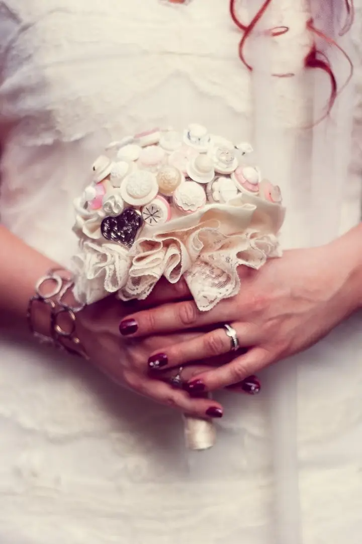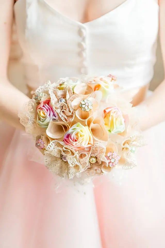 لمحبات الإطلالات الملكية الراقية، يمكنك إضافة بعض الأحجار الكريمة، أو المجوهرات واللؤلؤ الأبيض في وسط الوردة. وأحجار الراين، والترتر، والماس… وغيرها من اللمعان لإضافة لمسة من اللمعان على باقة الزفاف.