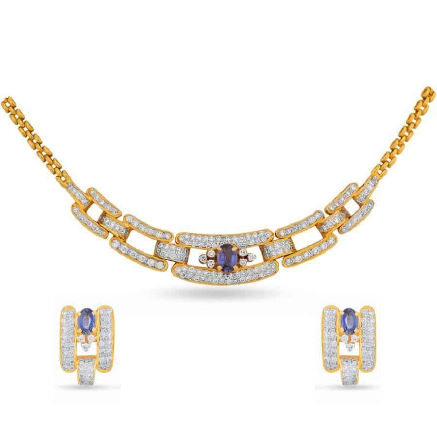 الطقم يحتوي على قلادة وقرطين من الذهب الأصفر والألماس لإطلالة أكثر تميزا في ليلة العمر.