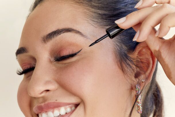 وإذا كنت لا تريدين ارتداء رموش اصطناعية، يمكنك استخدام محدد العيون السائل Aesthetica و وماسكرا لتكثيف الرموش KVD.