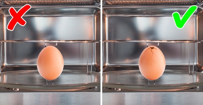 لذلك عليك تجنب وضع البيض في الميكروويف من أصله، وإذا كنت فاعلة فعليك ثقب البيض من الأعلى كما في الصورة.