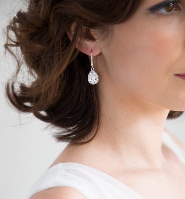صنارة الأقراط مرصعة بكريستالات دقيقة ومرصفة بطريقة جذابة وملفتة لتنتهي بتعليقة على شكل قطرة ماء التي تتصدر صيحات موضة هذه السنة في عالم المجوهرات والأكسسوارات الناعمة.