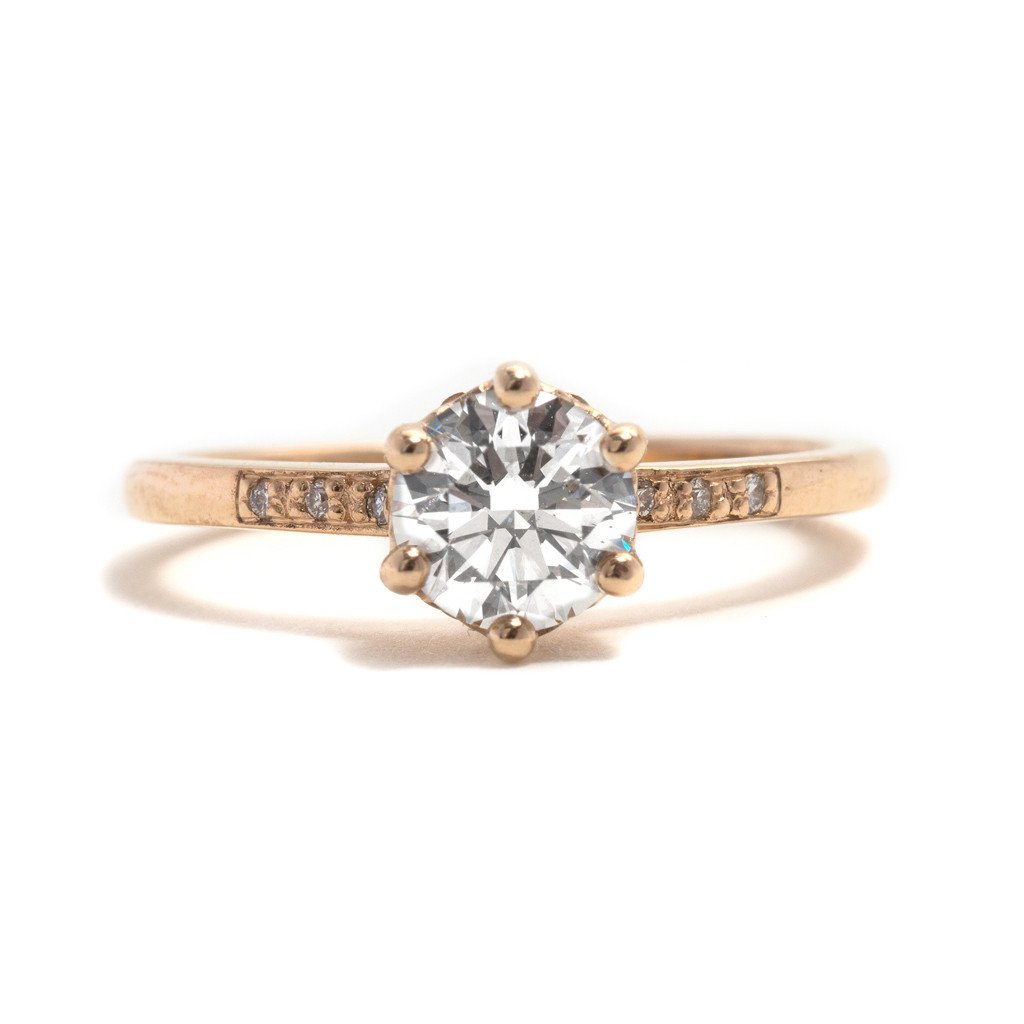 أبدعت Anne Sheffield في تصميم هذا الخاتم من الذهب الوردي حيث استوحت تفاصيله من خاتم جدتها الذي يعود للقرن الماضي .
