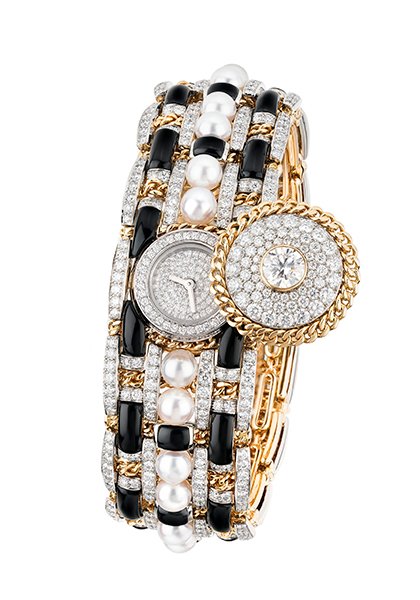 نقدم لك هذا الموديل من ماركة شانيل والذي يأتيك من الذهب الأصفر والأبيض المرصع بالألماس، اللؤلؤ والأونيكس، في تصميم فخم، ساحر ومترف مستلهمة من وحي أقمشة التويد الفرنسية.