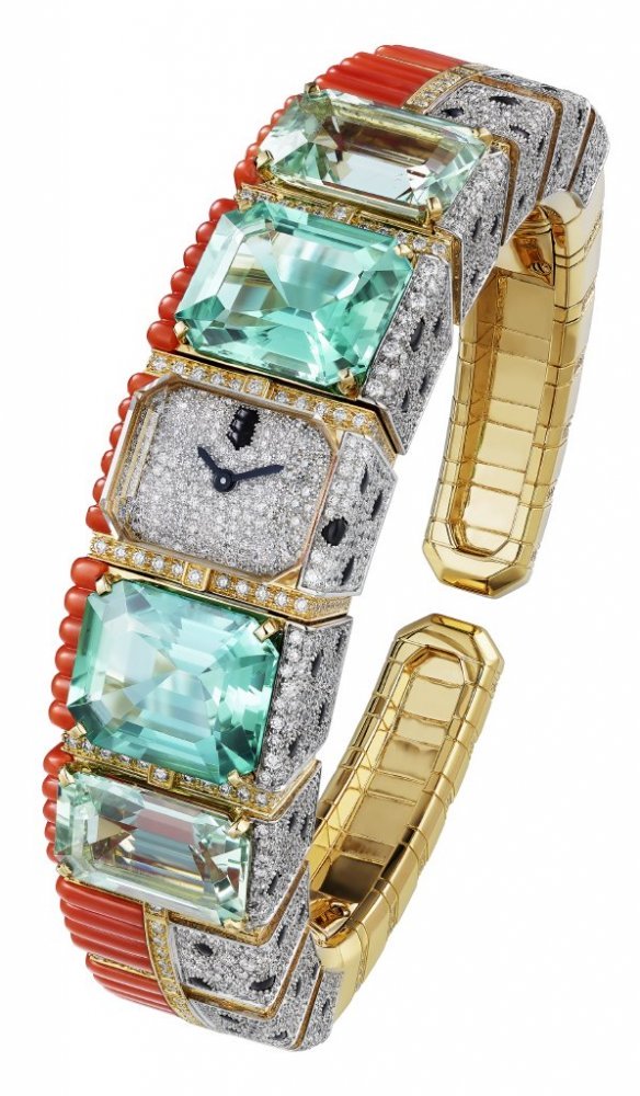 ومن علامة كارتيه نقترح عليك هذه الساعة المصنوعة من الذهب الأصفر المرصع بالألماس، الأونيكس، المرجان والأكوامارين.