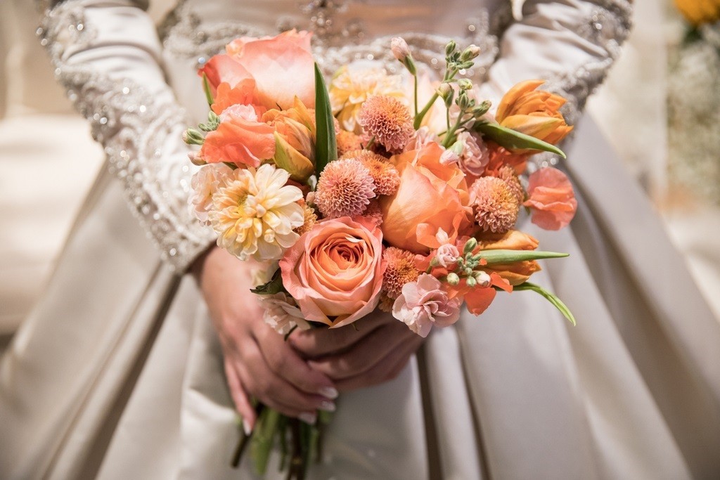 مسكة العروس: لما لا؟ تحتاج العروس لمسكة من الورد حتى تعزز إطلالتها، لذلك تعتبر فرصة مناسبة لاعتماد ورود باللون البرتقالي مع توظيفه بشكل بسيط هنا وهناك وسيفي ذلك بالغرض.