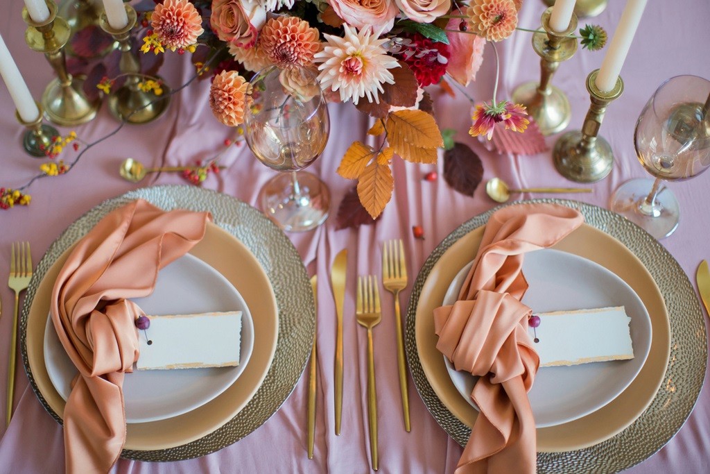 اعتمدي أدوات الطعام باللون الذهبي ثم اعتمدي مناديل باللون البرتقالي ليكفي بالغرض ويمنحك لمسة فاخرة ضمن ديكور الزفاف.