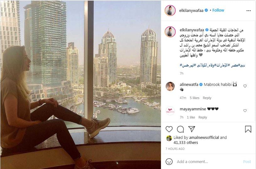 وفاء الكيلاني علقت أيضا بدورها من خلال نشر صورة خاصة لها في دبي “من الحاجات القلیلة الجمیلة اللي حصلت معاي السنه دي أني منحت وزوجي الإقامة الذهبية في دولة الإمارات العربیة المتحدة كل الشكر لصاحب السمو الشیخ محمد بن راشد آل مكتوم حفظھ الله وحكومة دبي؛ حفظ الله الإمارات وأھلھا الطیبین”.