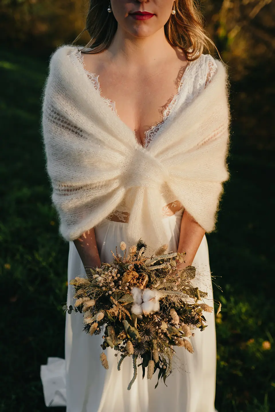 ملحق ضروري للسيدات اللواتي اخترن فستان زفاف بقصة واسعة أو بتنورة منفوشة، حيث يضمن الدفء والأناقة خاصة إذا قمت باختيار موديل مزين بالدنتيل الناعم على أن يكون باللون الأبيض.