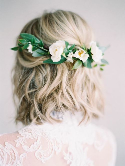 تسريحة تناسب العروس الرومانسية والحالمة، اتركي الشعر منسدل على طبيعته وزينيه بطوق من الورود المجففة أو الصناعية عند منتصف الشعر يثبت من الخلف.