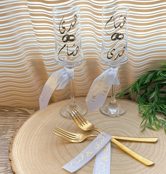 طقم أكواب زجاجية حسب الطلب: يمكنك الحصول على طقم أكواب زجاجية مصنوع من الكريستال الفاخر، يمكنك انتقائه بنقوش جذابة في حال كنت ستتقنين حجم متوسط أو كبير أو طباعة الحروف الأولى في حال كنت ستقتنين أكواب ثنائية فقط بشكل خاص للعروسان.