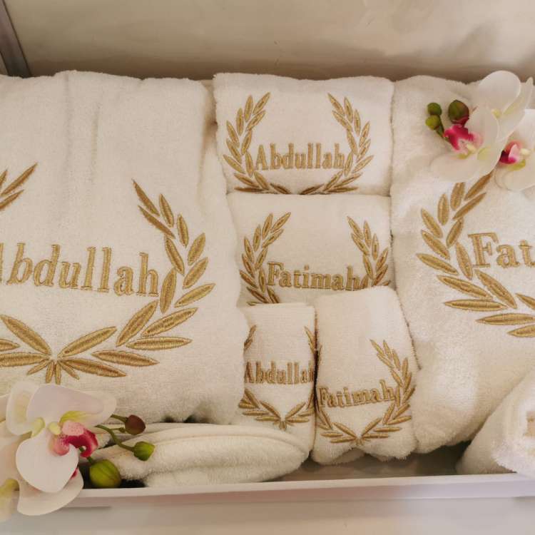 روب حمام مطرز: تعد هذه الفكرة مناسبة أيضا، احرصي على اختيار روب مزدوج للعروسان بخامة فخمة ثم قومي بتطريز عبارة تهنئة مناسبة أو اكتفي بتطريز حرف اسم العروس على الروب الخاص بها وحرف اسم العريس على الروب الخاص به.